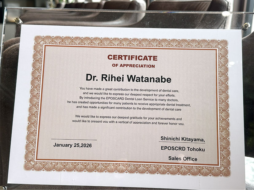 デンタルローン「エポスカード」より、患者様が適切な治療を受けられる機会を広げたとして、その功績が認められました。